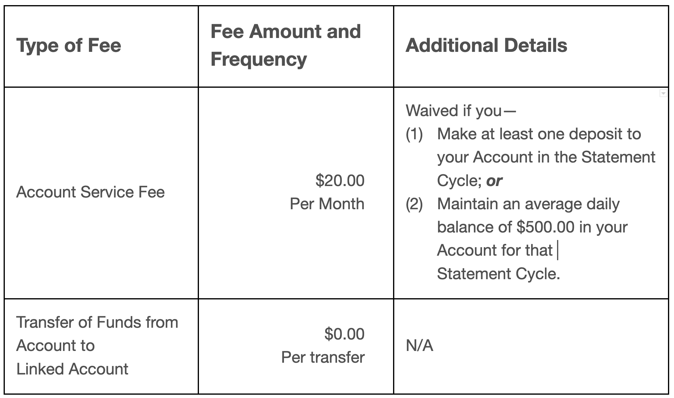 Evolve Deposit Account Fee Schedule